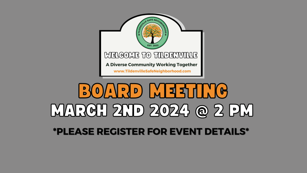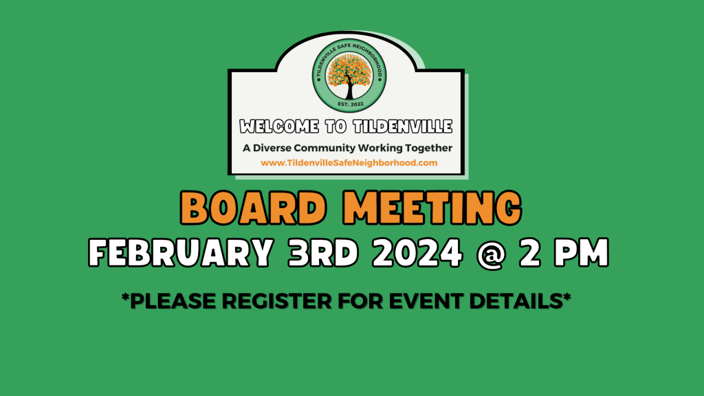 The Tildenville Safe Neighborhood meets every month on the first Saturday at 2 pm. This is a great opportunity to get involved, share updates, and plan upcoming events like the community meetings each quarter.